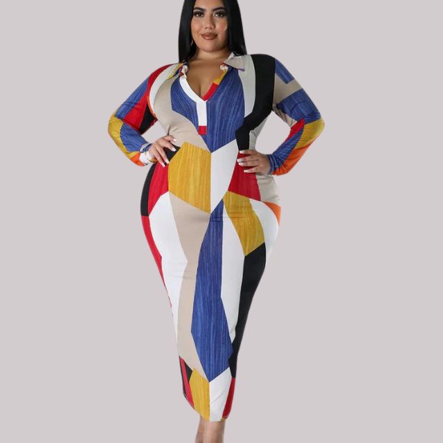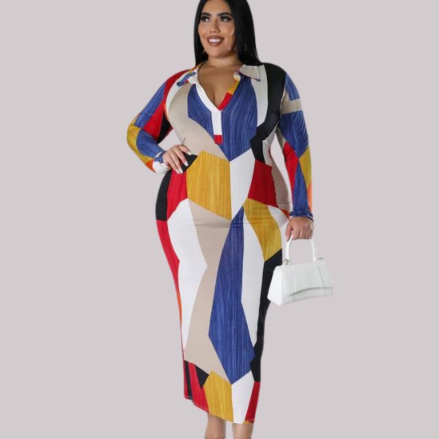 Elegant Women's Bodycon Midi Dress with V-Neck Collar, Long Sleeve Geometric Print