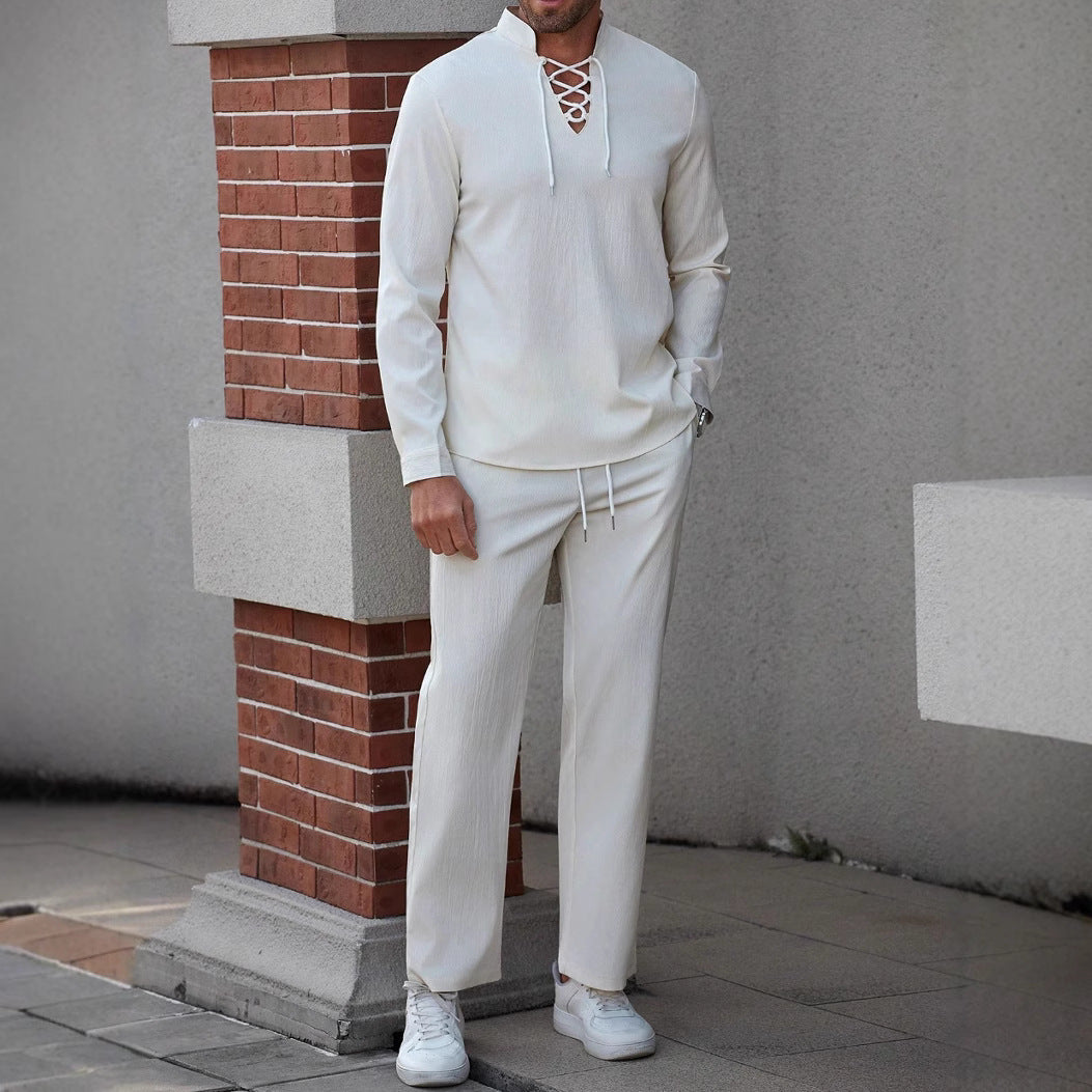 Męska koszula Henley marki Couture-Moda - mieszanka bawełny i lnu - sznurowana klatka piersiowa - luźny krój - kołnierzyk z gumką to Twój nowy styl bez wysiłku. Ta koszula o luźnym kroju ma stylową sznurowaną klatkę piersiową i wygodny kołnierzyk. Wykonany z oddychającej mieszanki bawełny i lnu z funkcjonalną kieszenią na piersi, ten Henley z długim rękawem zapewnia całodzienny komfort i odrobinę rustykalnego uroku.