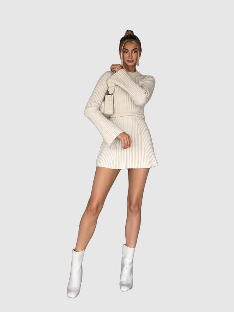 Ta sukienka mini z prążkowanej dzianiny to idealne połączenie wygody i stylu. Dzięki dopasowanemu krojowi i długim dzwonkowym rękawom jest to idealny wybór na chłodniejsze dni. Wykonana z rozciągliwego materiału, dopasowuje się do ciała, zapewniając maksymalny komfort. Połącz ją z botkami i torebką, aby uzyskać wyrafinowany, modny wygląd.