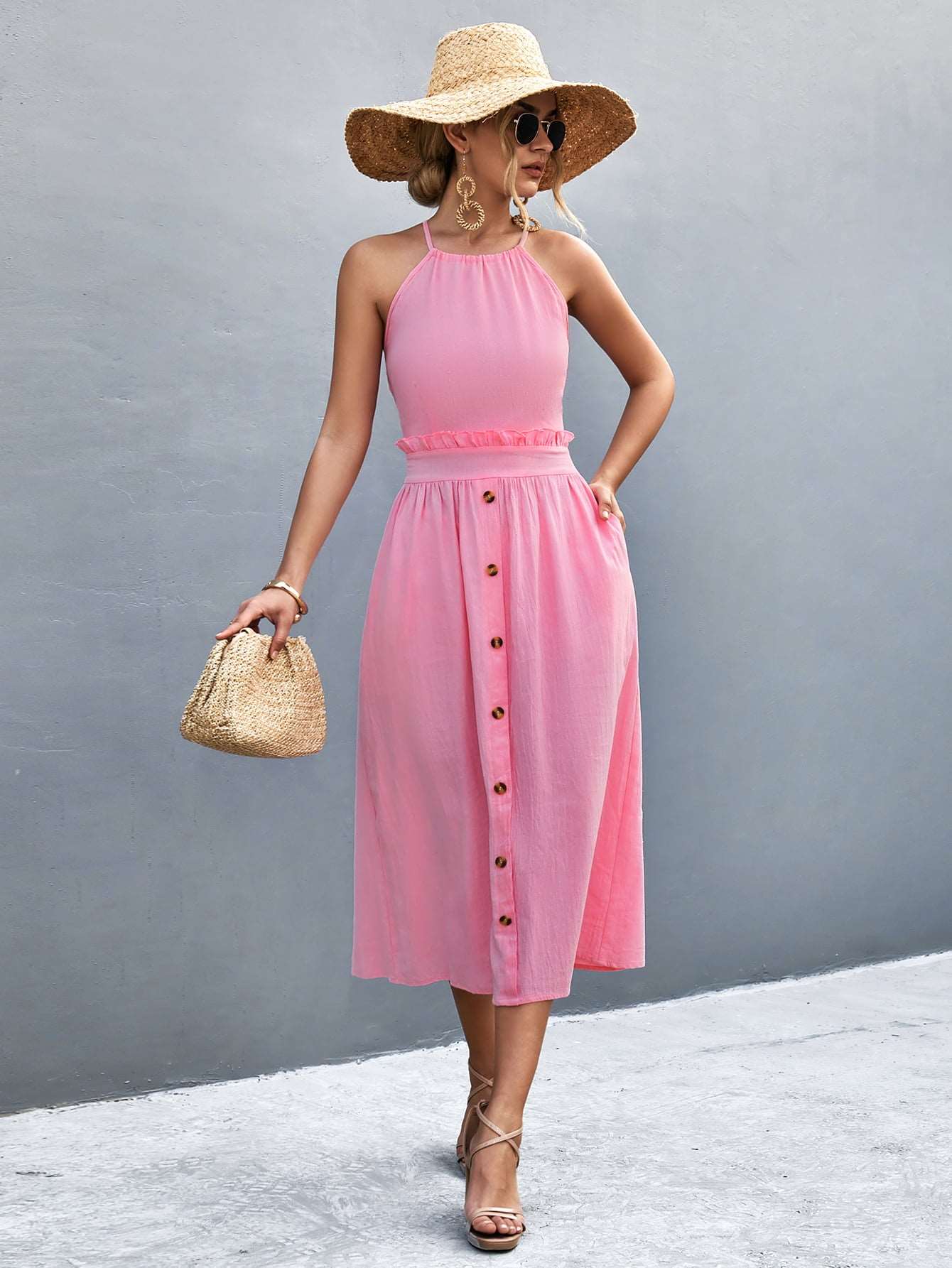 Women's Halter Neck Midi Dress - Sleeveless Button Front - Flowy A-Line Fit. This chic midi dress features a flattering halter neckline, sleeveless design, and a button-front detail that adds a touch of elegance. The flowy A-line silhouette makes it perfect for warm weather occasions and offers a comfortable, stylish fit.